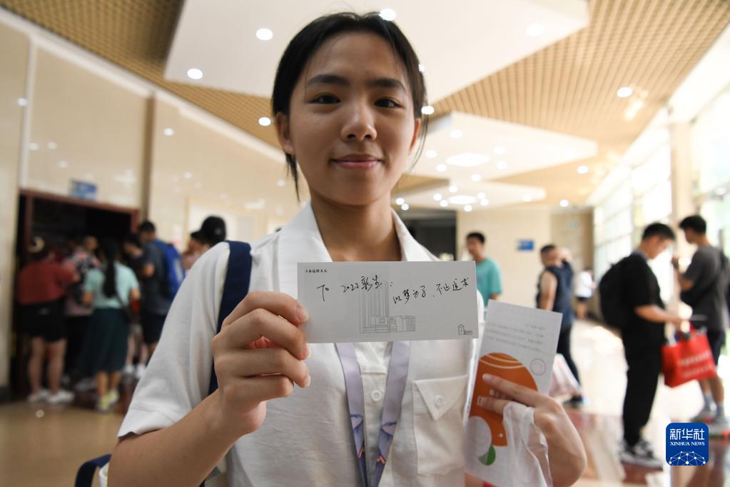 8月21日,中國科學技術大學2022級本科新生陳燁泓展示寫有學長學姐祝福的明信片。