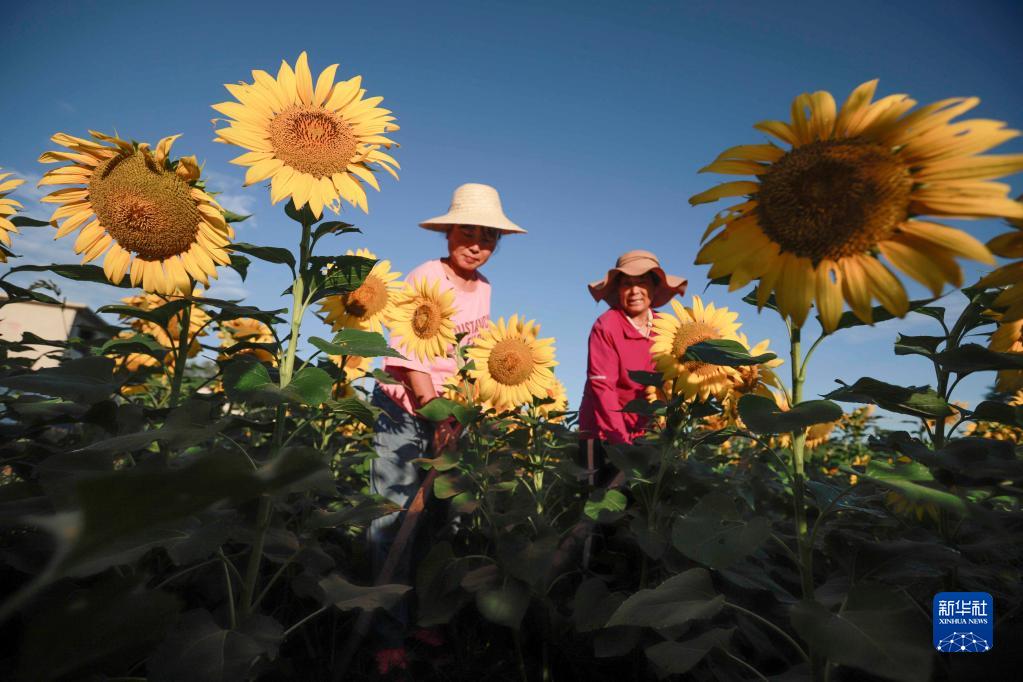 8月23日,河北省遵化市團瓢莊鄉山里各莊村村民在田間管護向日葵。