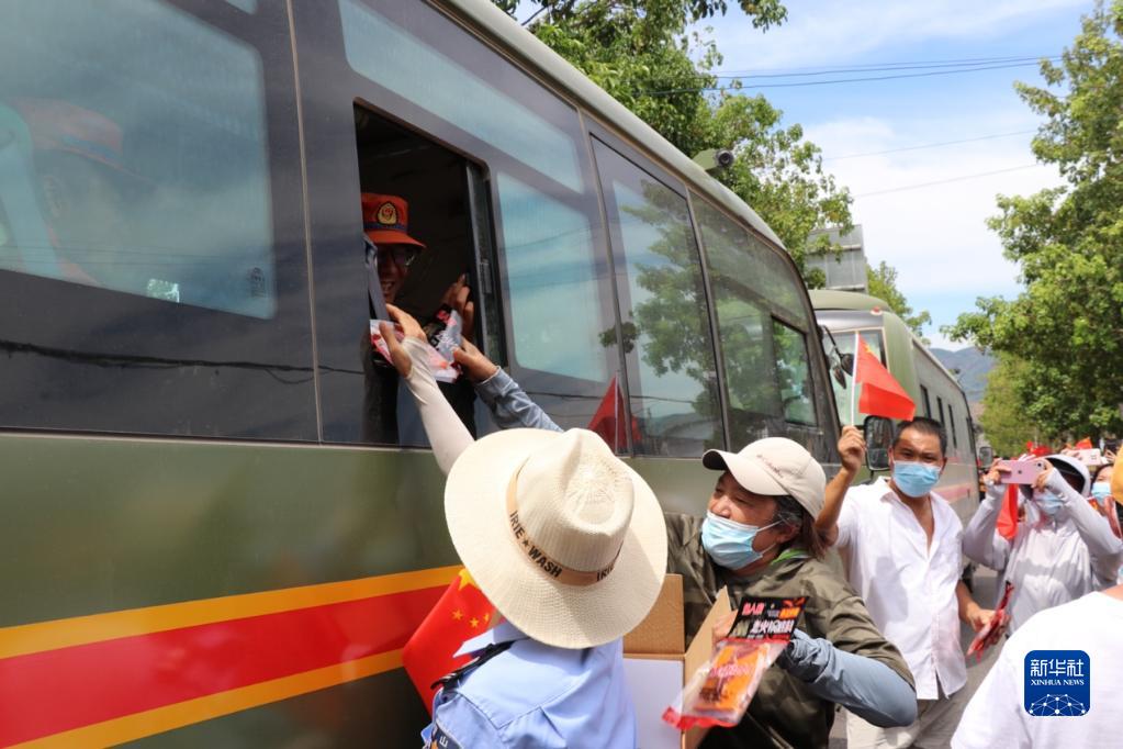 8月27日,在重慶市璧山區,村民將慰問品送給森林消防員。
