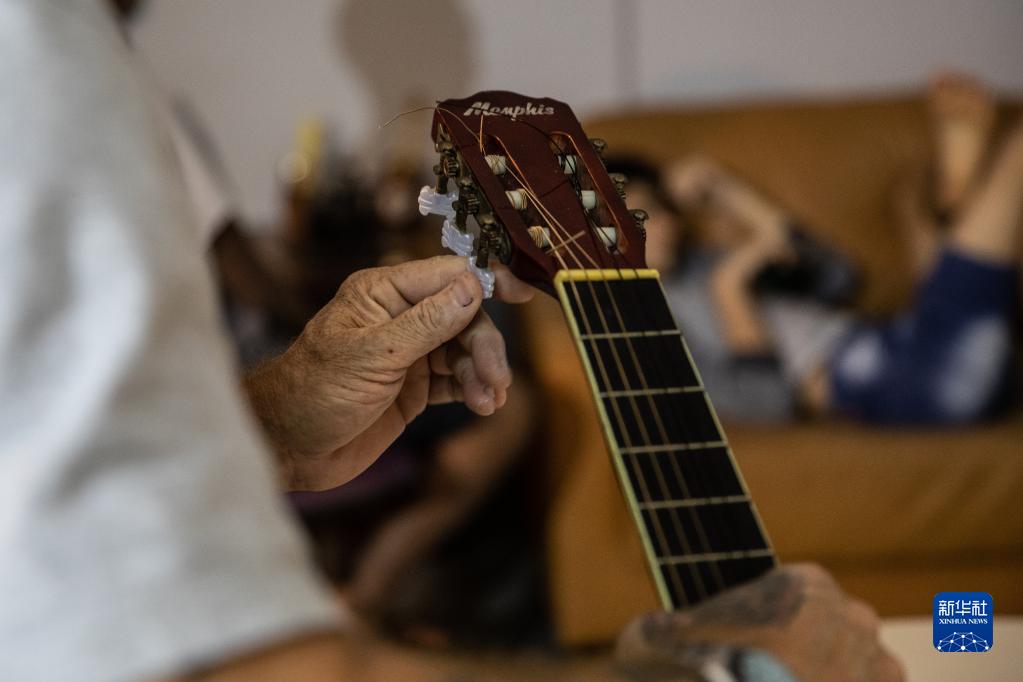 8月25日,在巴西里約熱內盧西區“上帝之城”社區,“彈奏聲音”項目負責人塞爾吉奧·弗雷塔斯在課堂上調試樂器。新華社記者 王天聰 攝