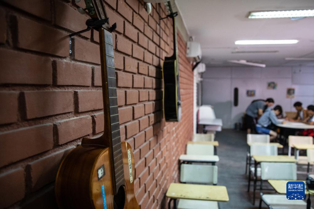 這是8月25日在巴西里約熱內盧西區“上帝之城”社區“彈奏聲音”教室拍攝的掛在墻上的樂器。新華社記者 王天聰 攝