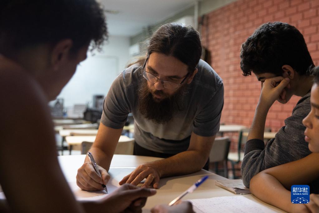 8月25日,安東尼奧(中)在巴西里約熱內盧西區“上帝之城”社區為學生們講課。新華社記者 王天聰 攝