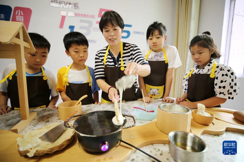 8月27日,在山東省臨沂市郯城縣郯城街道龍泉社區黨群服務中心,社區居民教孩子們烙制傳統手工煎餅。