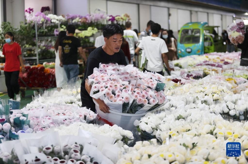 8月27日夜,昆明斗南花卉交易市場的商家在擺放鮮花。
