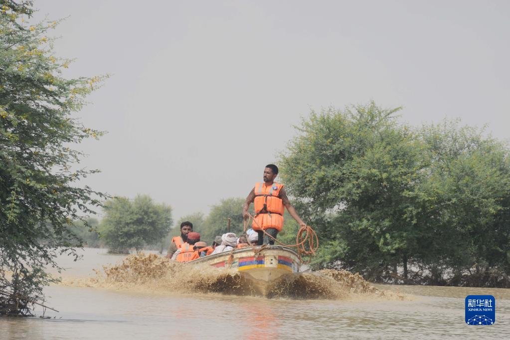 8月27日,在巴基斯坦拉金布爾,救援人員幫助受災民眾撤離。