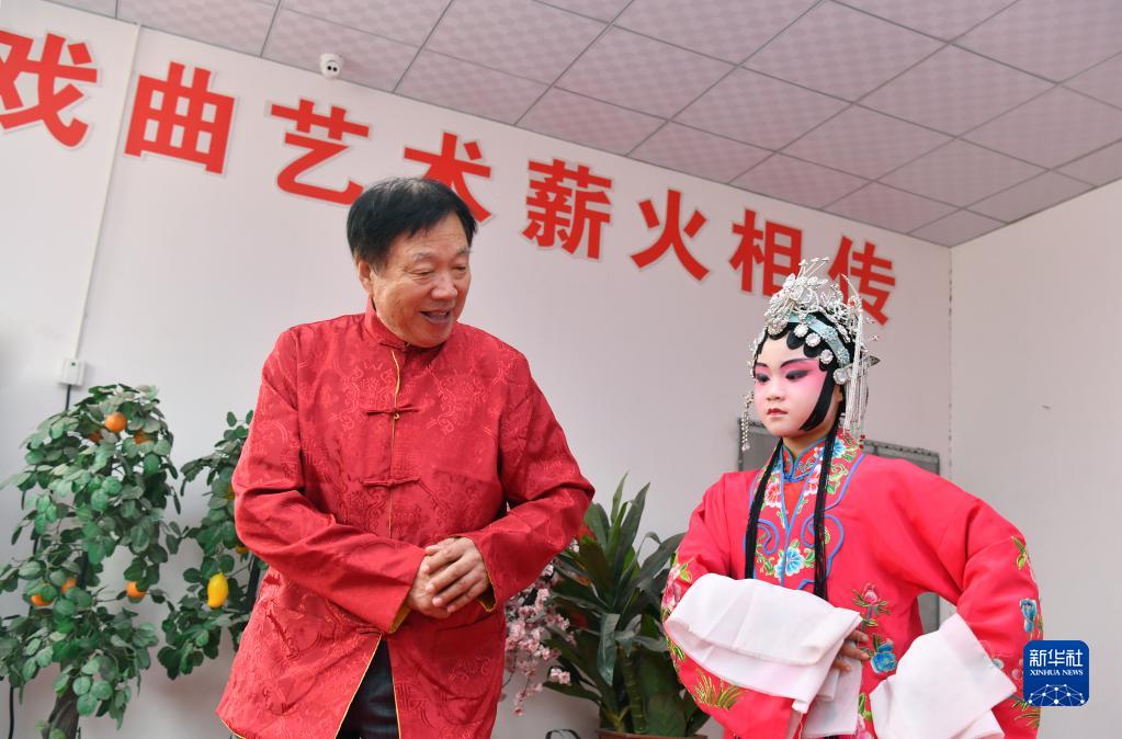 8月28日,在河北省青縣“哈哈腔”傳承示范基地,非遺傳承人劉宗發給小學員說戲。
