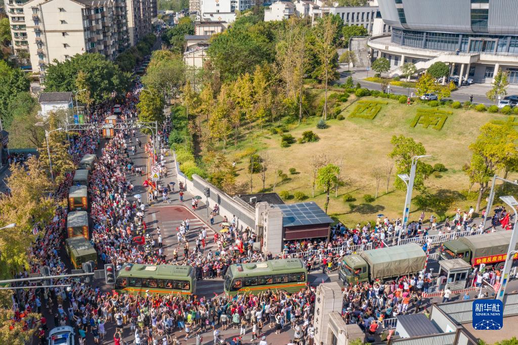 8月28日,在重慶市北碚區,群眾自發來到道路兩旁歡送森林消防隊員(無人機照片)。