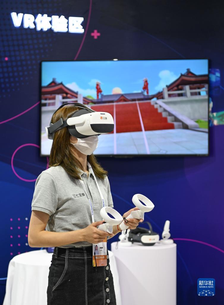 8月28日,在國家會展中心(天津),參會者在2022年中國網絡文明大會展區內體驗VR設備。