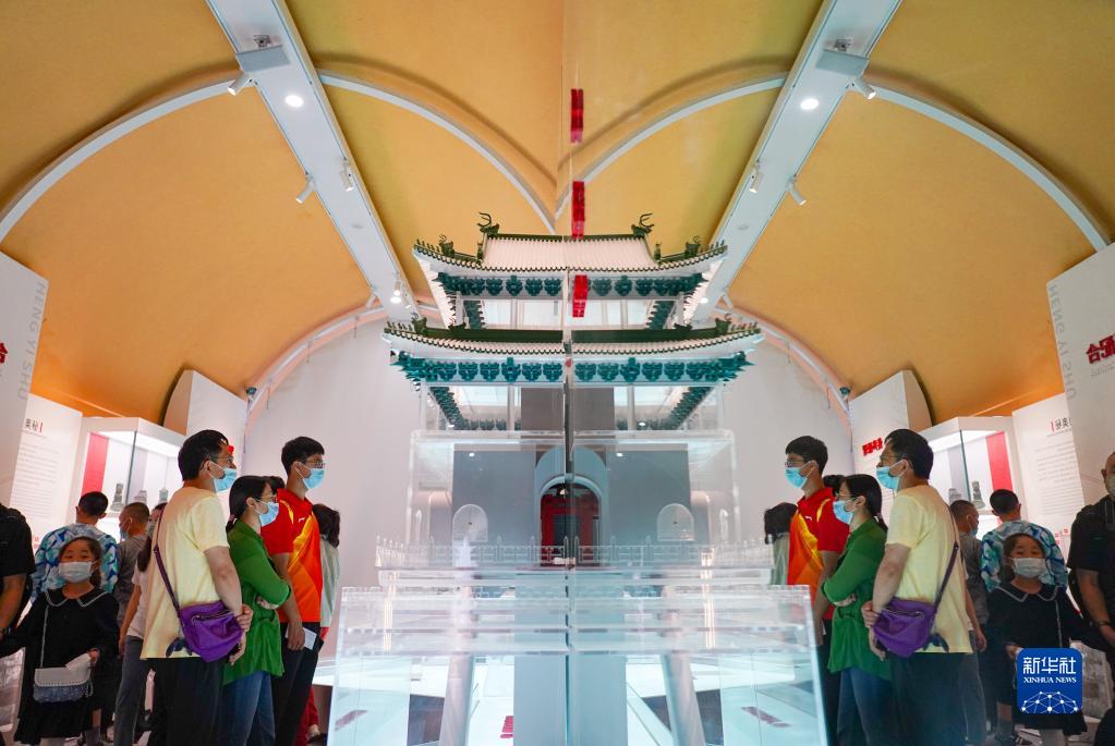8月28日,觀眾觀看鏡像效果下的北京鐘樓模型。