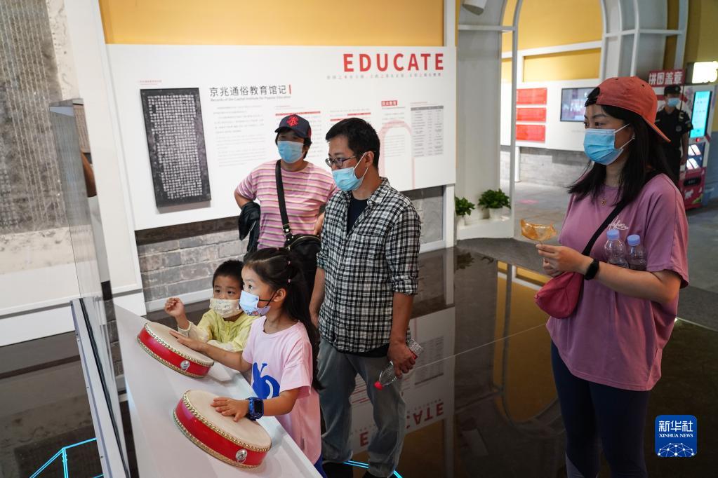 8月28日,兒童在北京鼓樓一層體驗擊鼓。