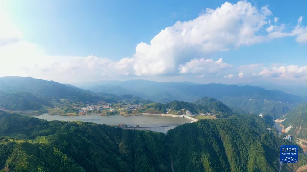 8月28日拍攝的福建周寧抽水蓄能電站上水庫(左)、下水庫(右),輸水系統和地下廠房位于兩個水庫中間的山體內部(無人機照片)。