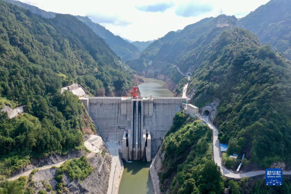 8月28日拍攝的福建周寧抽水蓄能電站下水庫108米碾壓混凝土重力壩(無人機照片)。