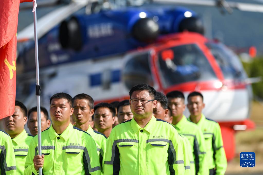 8月28日,在重慶龍興通用機場,參與重慶火場撲救任務的航空應急救援人員出席慰問儀式。