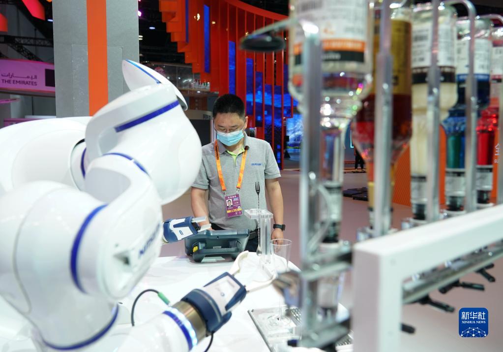 8月28日,工作人員在調試一款參展2022年服貿會的雙臂協作機器人。