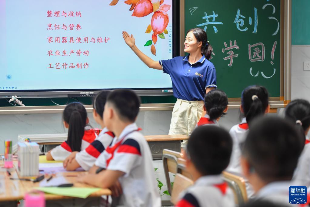 8月29日,在長沙市天心區青園南湖小學,老師向學生介紹勞動課程的內容。