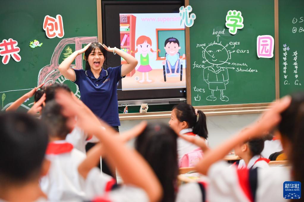 8月29日,在長沙市天心區青園南湖小學,老師在英語課上和學生互動。