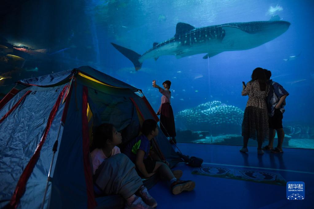 8月27日,體驗者在珠海長隆海洋王國鯨鯊館搭帳篷夜宿,在鯨鯊保育專家的科普中增長知識,近距離體驗與鯨鯊等海洋生物同眠的奇妙之夜,感受人與自然和諧相處,傳遞生態保護理念。