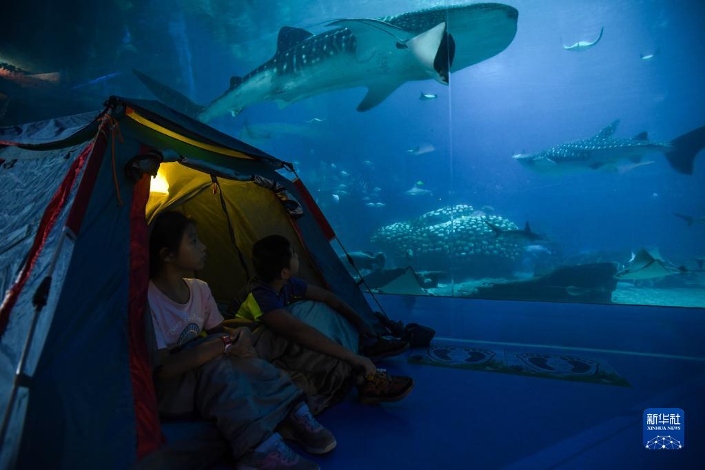 8月27日,體驗者在珠海長隆海洋王國鯨鯊館搭帳篷夜宿,在鯨鯊保育專家的科普中增長知識,近距離體驗與鯨鯊等海洋生物同眠的奇妙之夜,感受人與自然和諧相處,傳遞生態保護理念。