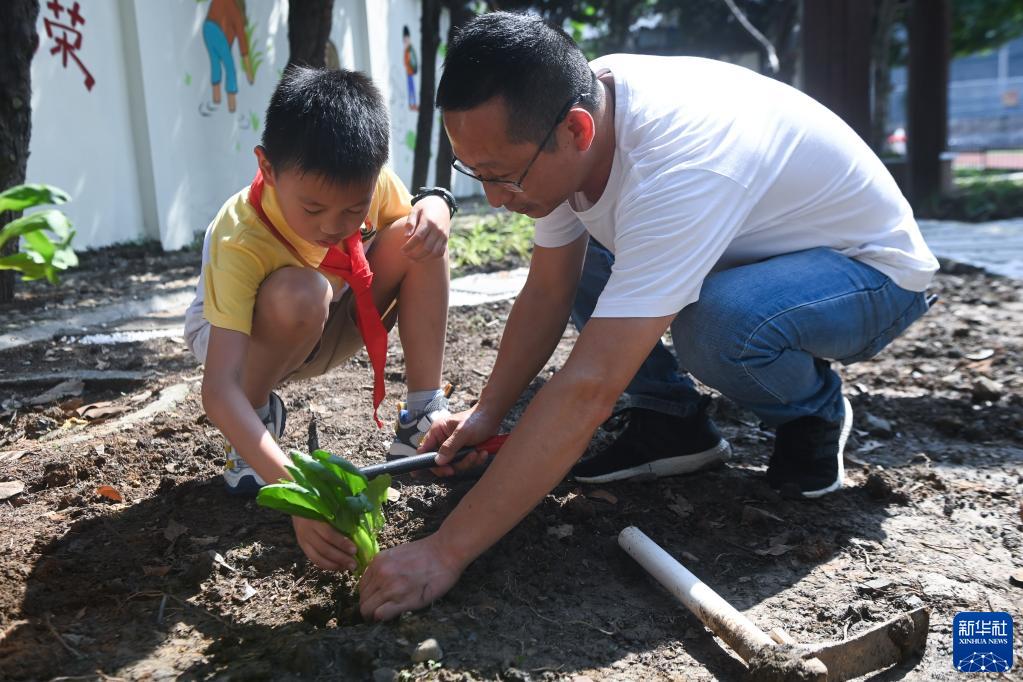 8月29日,龍泉小學老師帶領學生在校園里的“方圓農場”學習種菜。