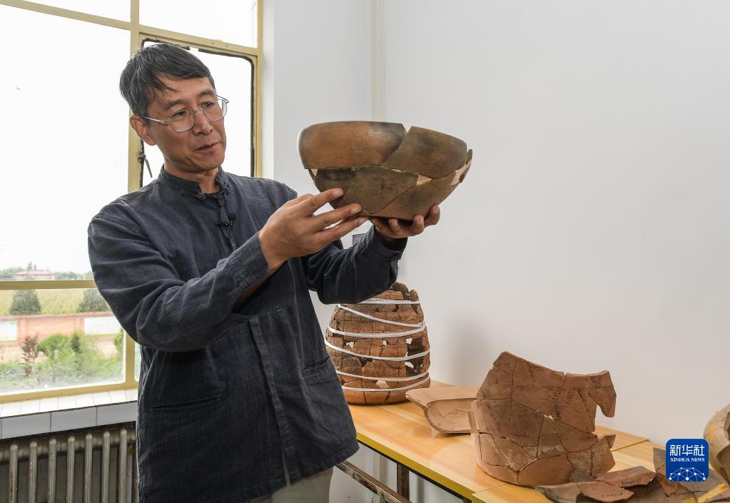 南佐遺址聯合考古隊領隊、中國人民大學歷史學院考古文博系教授韓建業在遺址研究基地內展示出土的陶器(8月23日攝)。