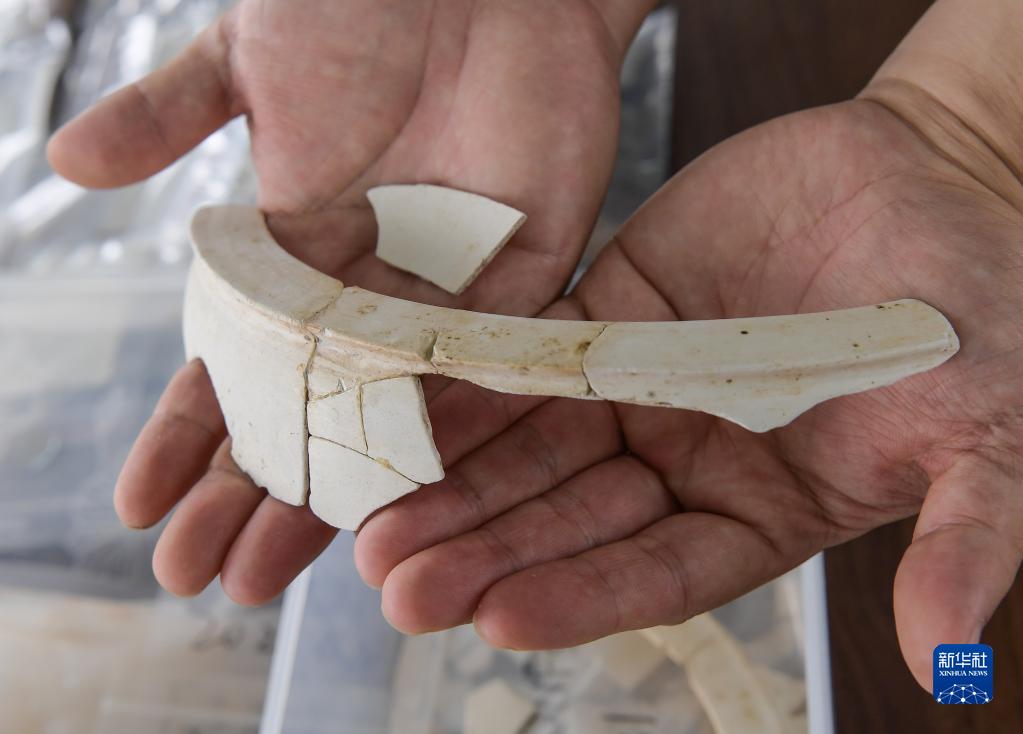 考古工作人員在展示南佐遺址內出土的白陶器殘片(8月23日攝)。