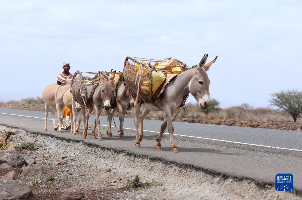8月26日,在遭受旱災的肯尼亞馬薩比特郡萊薩米斯鎮,一名女子趕著馱水的驢隊走在路上。