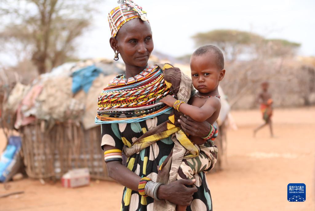 8月26日,一名女子抱著孩子站在肯尼亞馬薩比特郡萊薩米斯鎮一干旱的村莊內。