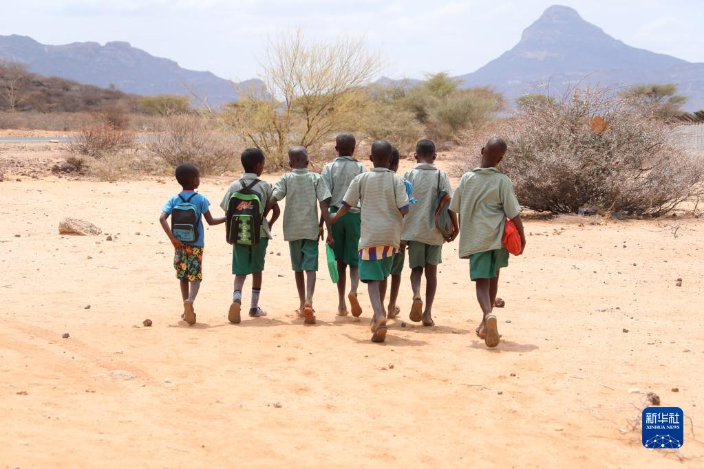 8月26日,在遭受旱災的肯尼亞馬薩比特郡萊薩米斯鎮,孩子們放學回家。他們從學?;丶倚枰叫?公里。