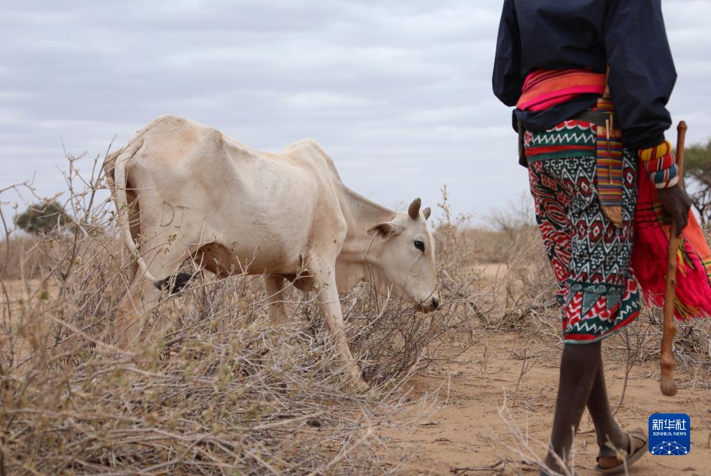 8月27日,在遭受旱災的肯尼亞馬薩比特郡萊薩米斯鎮,一頭牛在吃干枯的枝條。放牛男子家里的70多頭牛因干旱死亡多半,目前僅存活20余頭。
