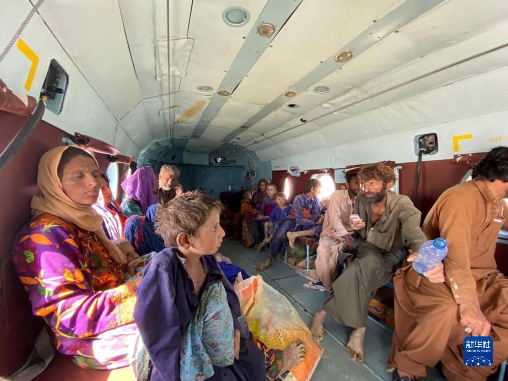 8月28日,在巴基斯坦俾路支省賈法拉巴德地區,一些災民登上直升機等待轉移。