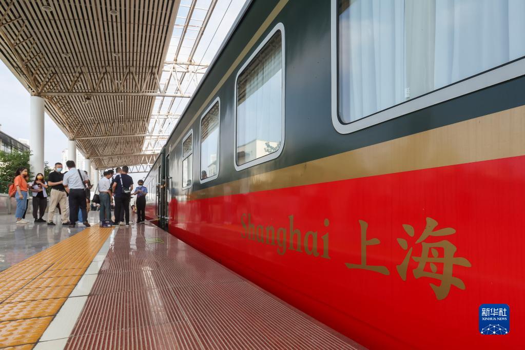當日,Y701次上海至嘉興“南湖·1921”紅色旅游列車恢復開行。這是長三角地區疫情趨穩后,中國鐵路上海局集團有限公司今年推出的首趟常態化開行的跨省紅色旅游列車。