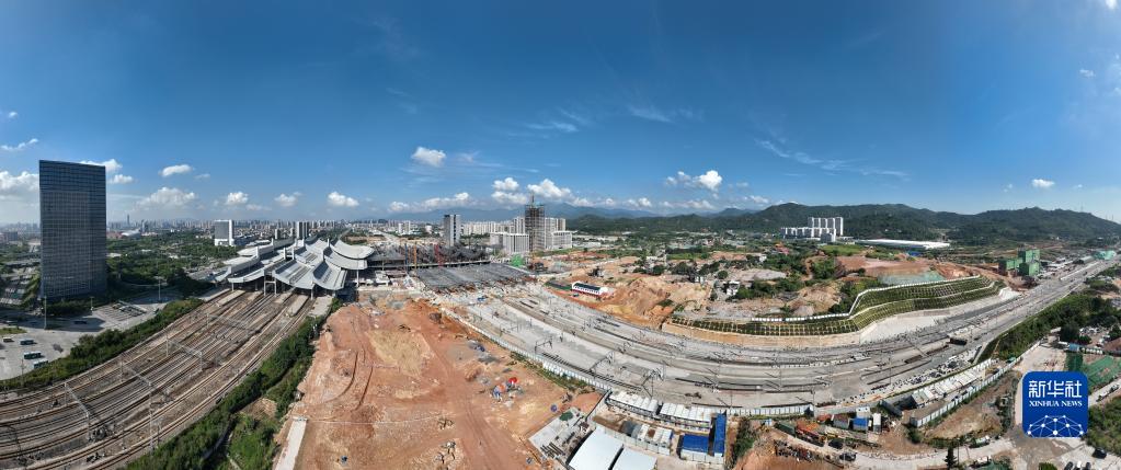 這是8月30日拍攝的新建福廈鐵路廈門北站施工現場(無人機合成照片)。