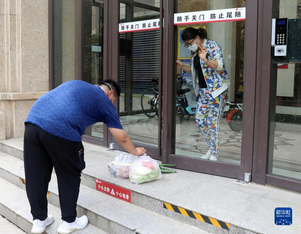 8月30日,在石家莊市眾美綠都小區,社區志愿者為社區居民送生活物資。