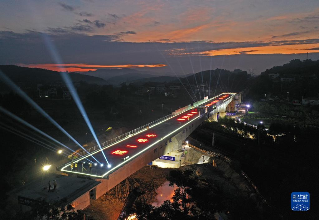 當日,廣西南(寧)玉(林)鐵路全線最大噸位雙幅轉體橋——福慶特大橋跨湘桂鐵路轉體橋在順時針旋轉后成功對接,兩幅對接后的轉體橋成為上跨湘桂鐵路的空中走廊,標志著南玉鐵路建設取得重大突破。福慶特大橋全長945米,轉體部分的橋梁梁體總長220米,總重量超過1.2萬噸。