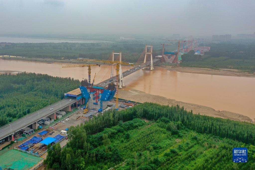 8月30日拍攝的濟南黃河公路大橋擴建工程施工現場(無人機照片)。