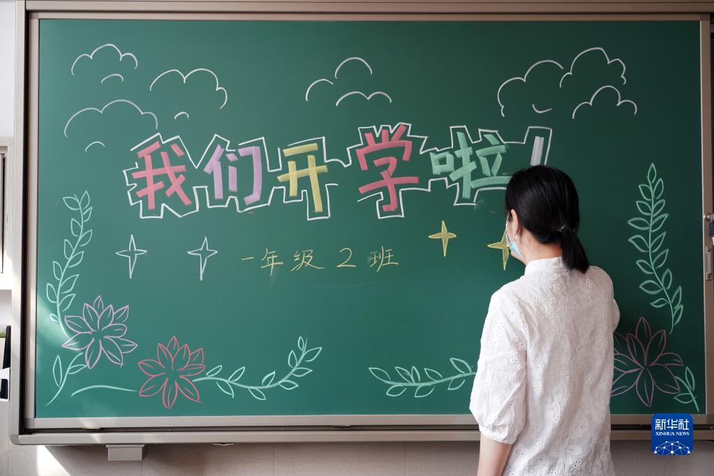 8月30日,人大附中實驗小學的老師在書寫新學期黑板報。
