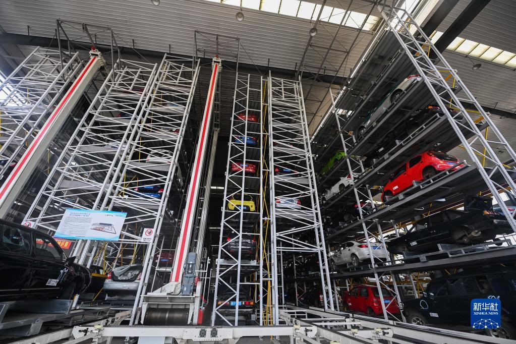 8月30日,在湖州市吳興區東林鎮一家機動車回收拆解企業的智能化立體存儲庫內,等待拆解的機動車有序停放在存儲架上。