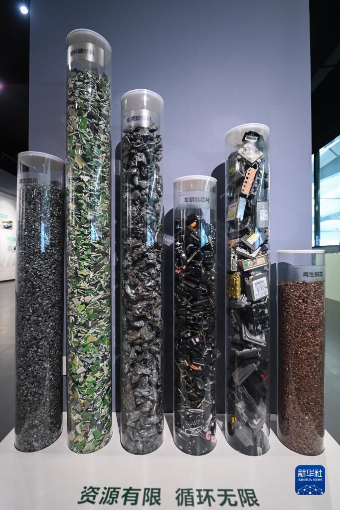 8月30日在湖州市吳興區東林鎮一家機動車回收拆解企業的展廳內拍攝的機動車拆解后可以分類再利用的資源。