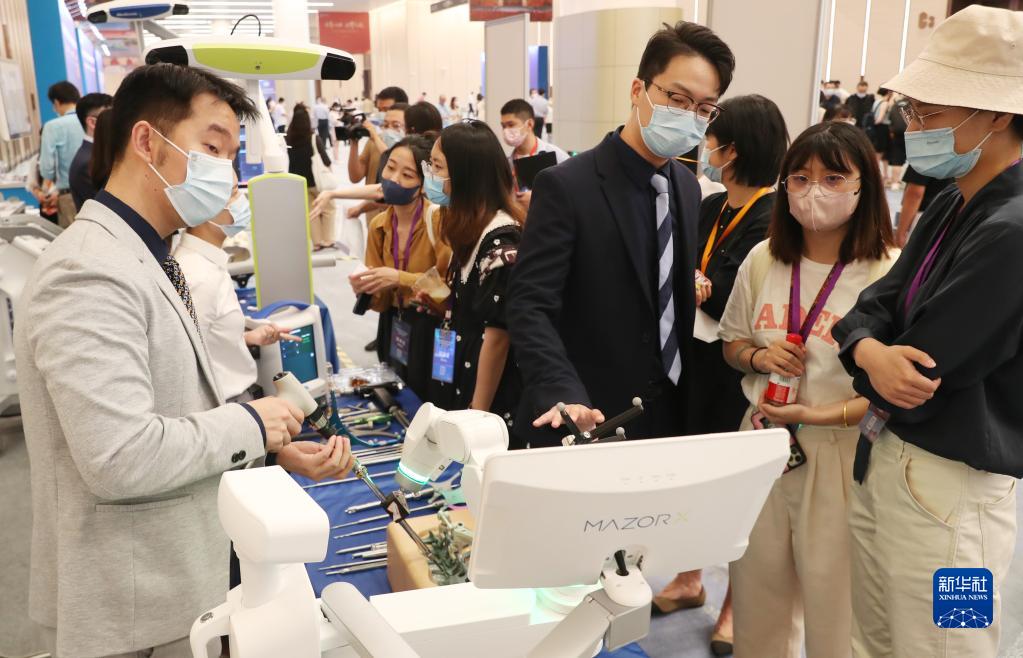 8月30日,一名醫療器械參展企業的工作人員(前右三)在對接會現場向嘉賓介紹產品。