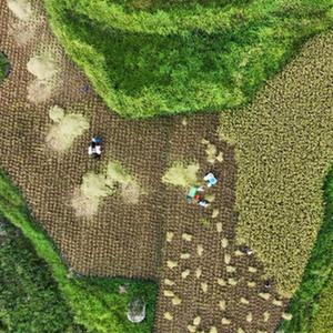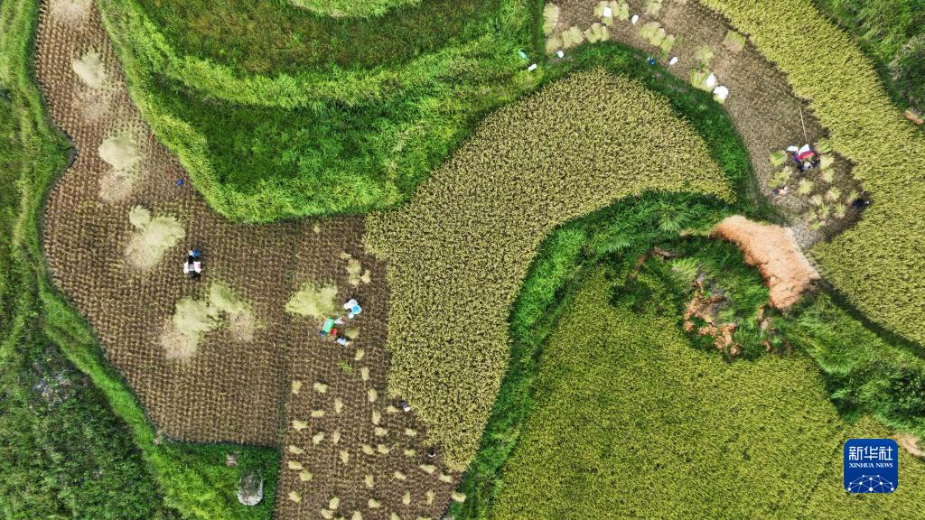 8月30日,村民在羅甸縣沫陽鎮紅星村收割稻谷(無人機照片)。