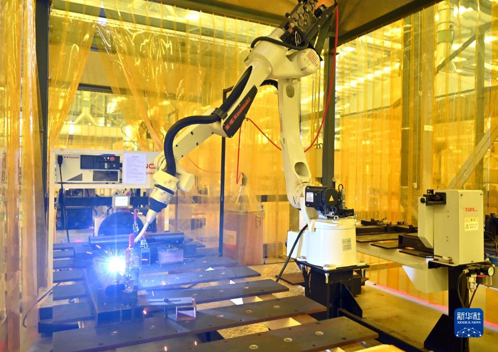 8月30日,在日照經濟技術開發區一家企業加工車間,機械手臂對動感單車結構件進行自動焊接。