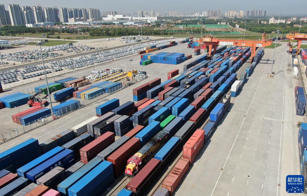 8月31日,滿載土庫曼斯坦甘草中藥材原料的中歐班列回程列車抵達西安國際港站(無人機照片)。