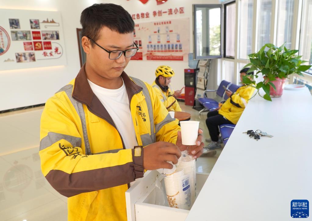 8月31日,在單縣園藝街道紫玉東郡小區“暖新驛站”,一名外賣配送員在取用一次性水杯。