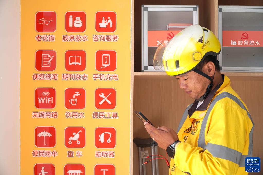 8月31日,在單縣園藝街道黃樓社區“暖新驛站”,一名外賣配送員在給手機充電。