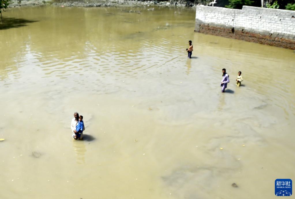8月31日,在巴基斯坦西北部開伯爾-普什圖省的賈爾瑟達地區,人們走在洪水中。