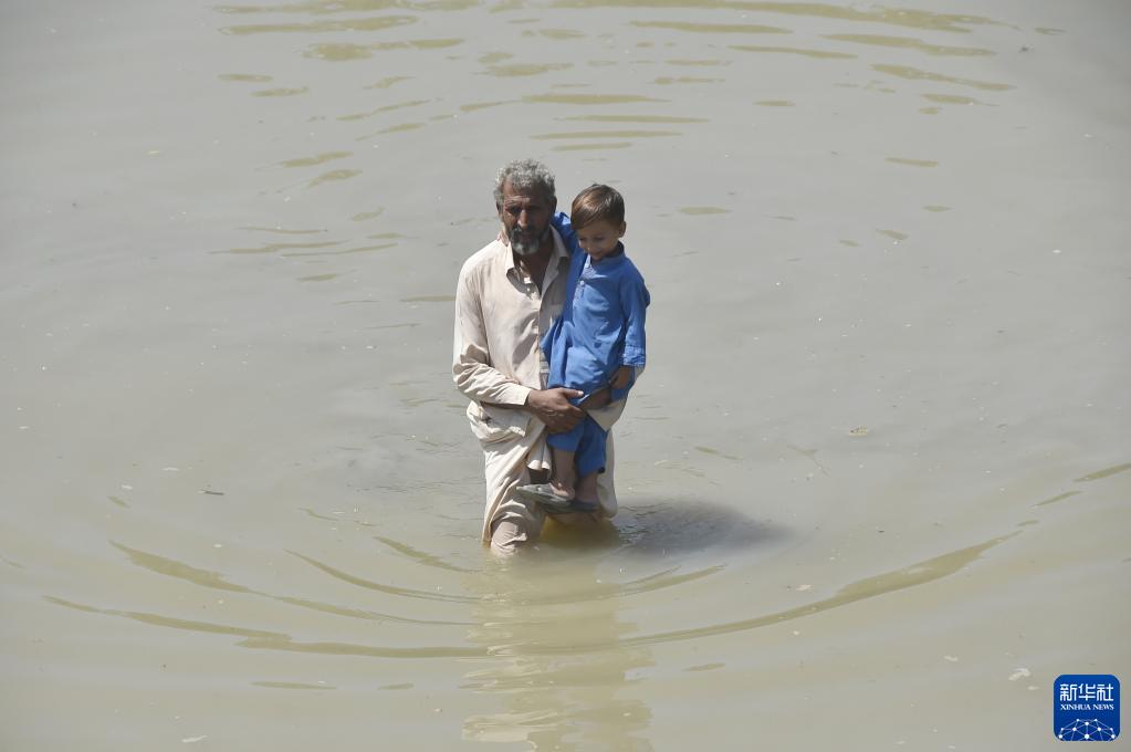 8月31日,在巴基斯坦西北部開伯爾-普什圖省的賈爾瑟達地區,一名老人抱著孩子走在洪水中。