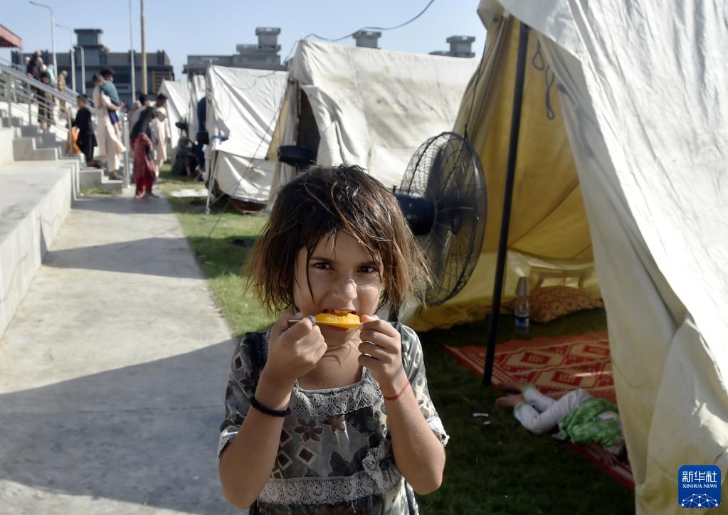 8月31日,在巴基斯坦西北部開伯爾-普什圖省的賈爾瑟達地區,一名小女孩在救災帳篷外吃東西。