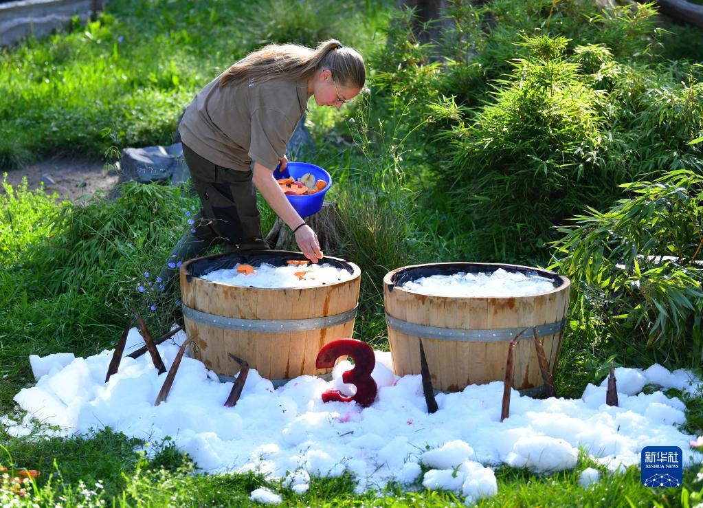 8月31日,在德國柏林動物園,工作人員為大熊貓雙胞胎“夢想”和“夢圓”準備“生日桶”。