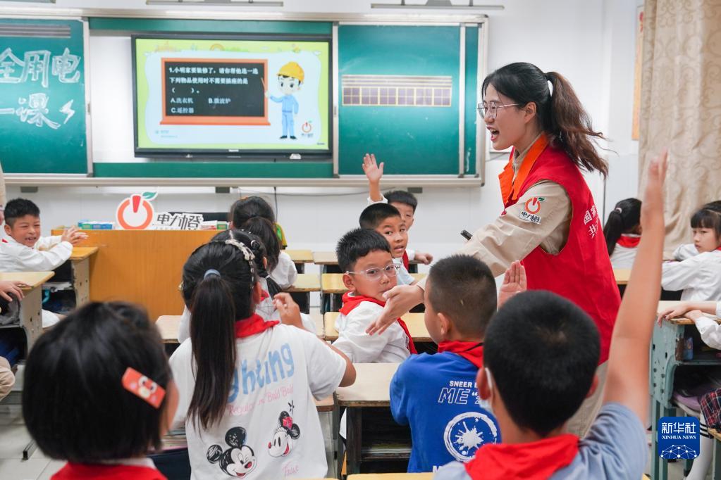 9月1日,江蘇省揚州市寶應縣供電公司的志愿者與寶應縣安宜實驗學校的學生進行安全用電知識互動問答。