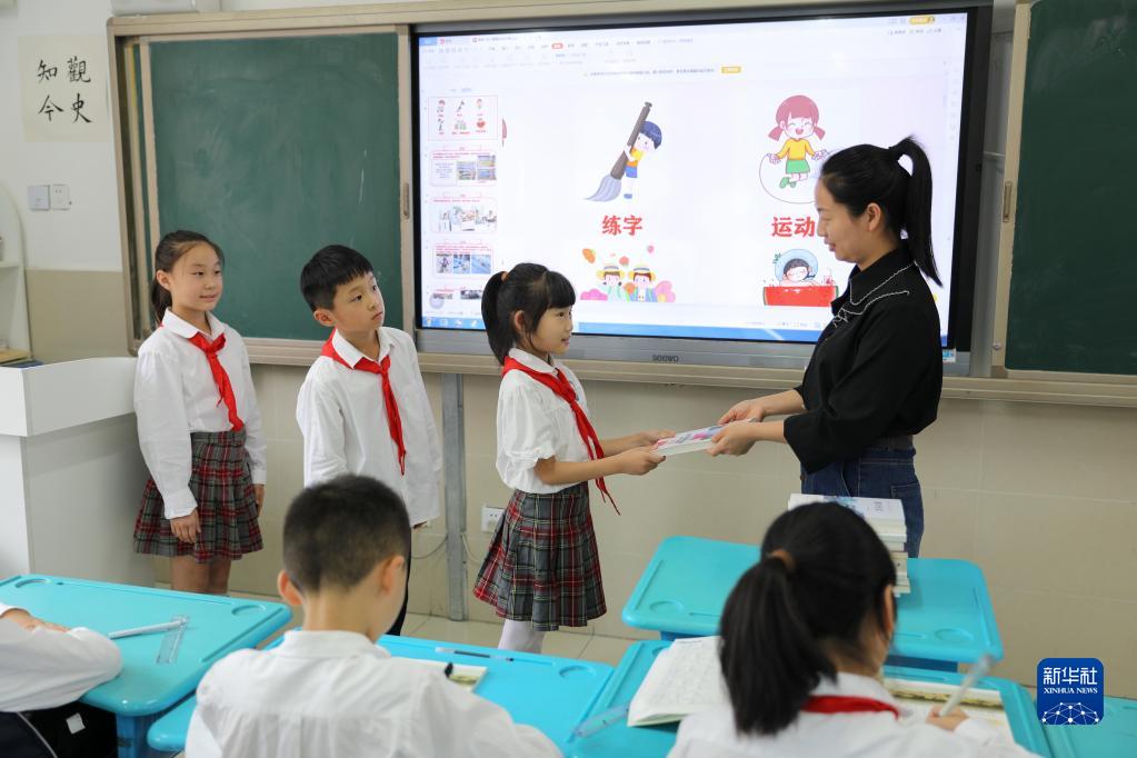 9月1日,安徽合肥市六安路小學翠微分校的老師向四年級學生贈送圖書。
